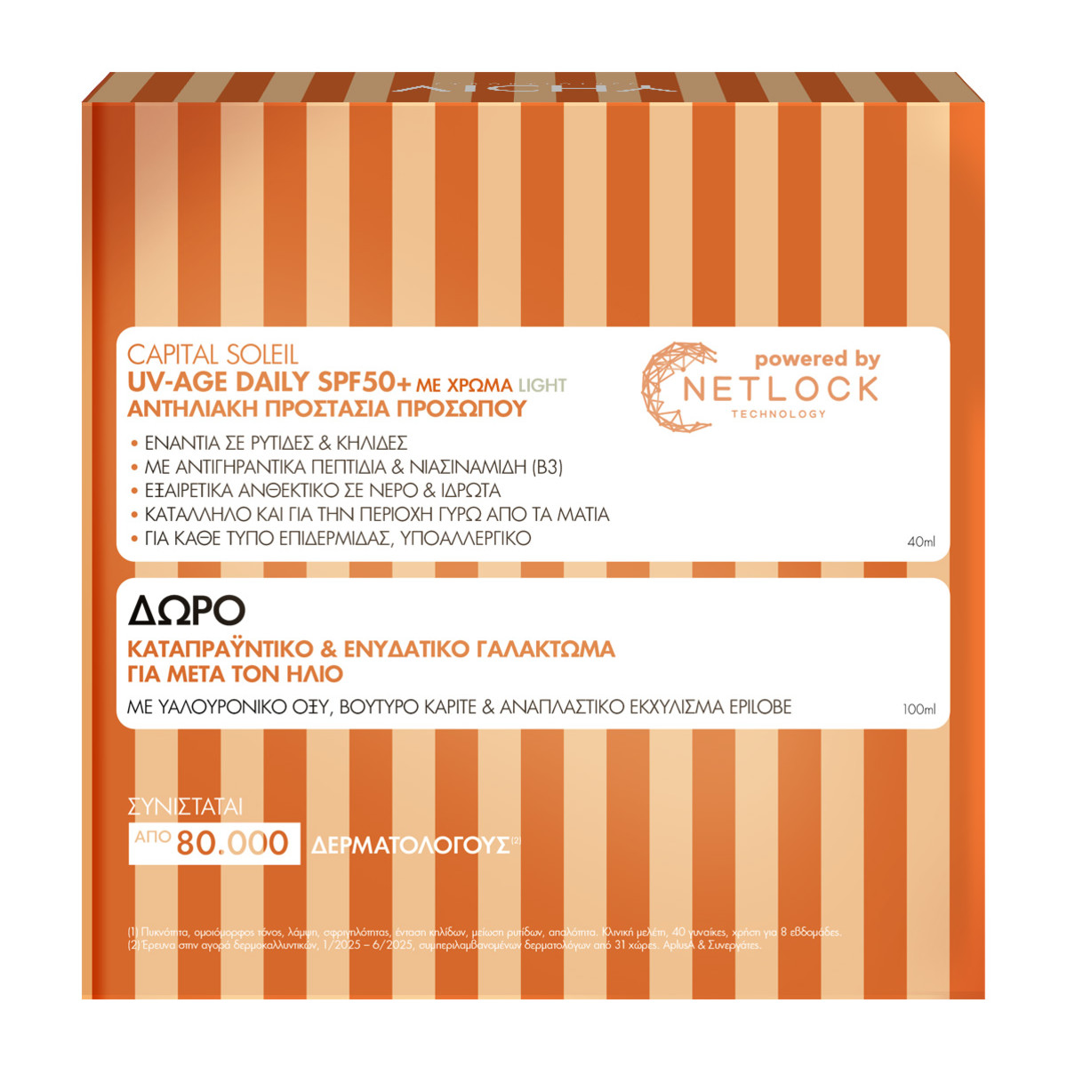 Η τεχνολογία Netlock, κατοχυρωμένη με πολλαπλά διπλώματα ευρεσιτεχνίας, σχηματίζει ένα εξαιρετικά λεπτόρρευστο και ανθεκτικό φιλμ πολύ υψηλής UV προστασίας με αόρατο τελείωμα, για προηγμένη αντηλιακή προστασία ενάντια στις ακτινοβολίες UVB και UVA, οι οποίες ευθύνονται για πάνω από το 80% των σημαδιών γήρανσης. Είναι εμπλουτισμένο με αντιγηραντικά δερματολογικά δραστικά συστατικά όπως πεπτίδια και νιασιναμίδη Β3, για να βελτιώνει ορατά τα σημάδια της φωτογήρανσης: κηλίδες, ρυτίδες, απώλεια σφριγηλότητας και θαμπή όψη. Το ΔΩΡΟ after sun αποτελεί την ιδανική επιλογή για μετά τον ήλιο για ενυδάτωση σε πρόσωπο και σώμα. Ενισχυμένο με υαλουρονικό οξύ, βούτυρο καριτέ κα αναπλαστικό εκχύλισμα Epilobe, προσφέρει όλα όσα χρειάζεται η επιδερμίδα μετά την έκθεσή της στο ήλιο.